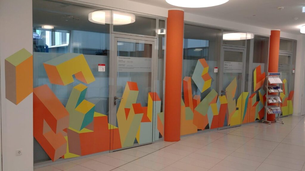Produktion und Montage einer Folienbeschriftung nach Kundenvorgabe am Universitätsklinikum Bonn.